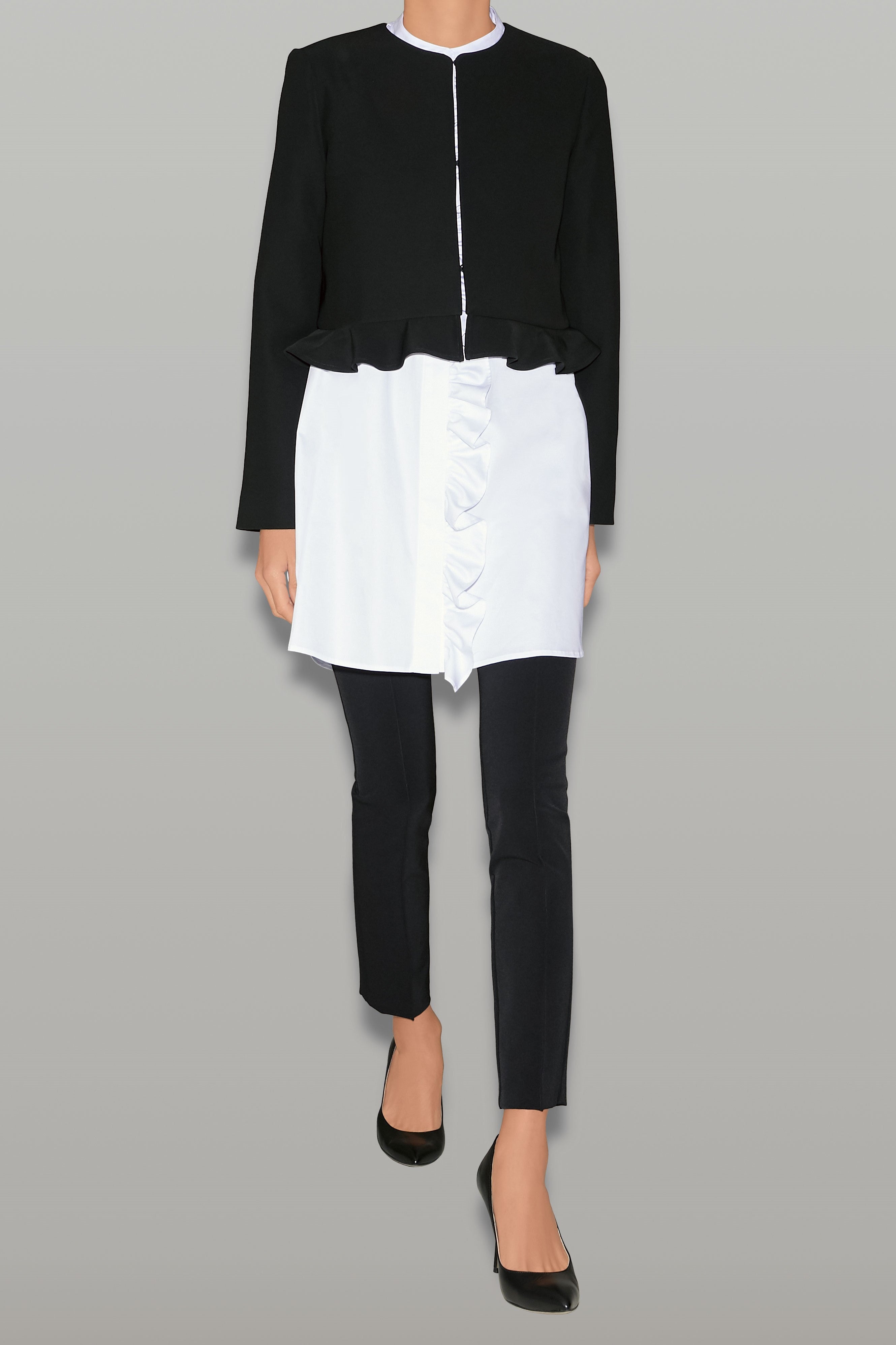 ヘムラインのラッフルがフェミニンな印象のショートジャケット。コンパクトな着丈でスタイルアップが叶う一着。程よい厚みと膨らみ感のあるボンディング加工を施した滑らかな質感の生地で仕立てており、同素材のドレスやボトムと合わせてセットアップスタイルが楽しめます。