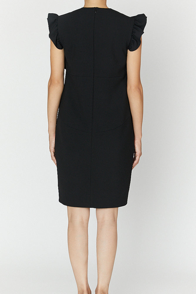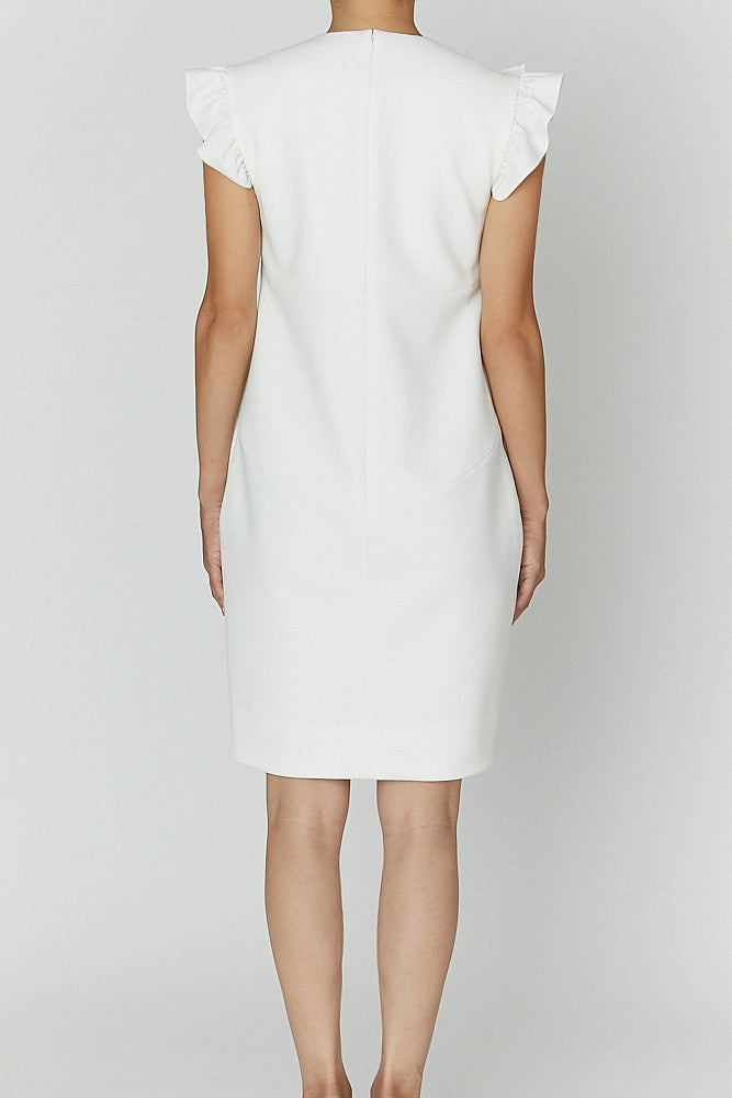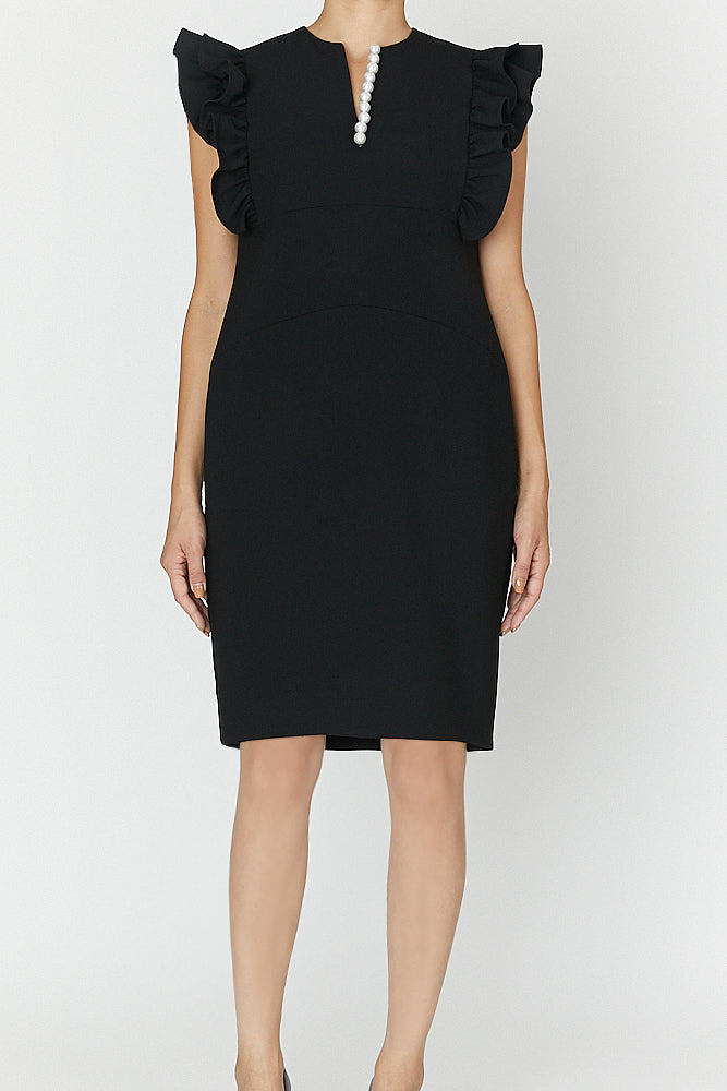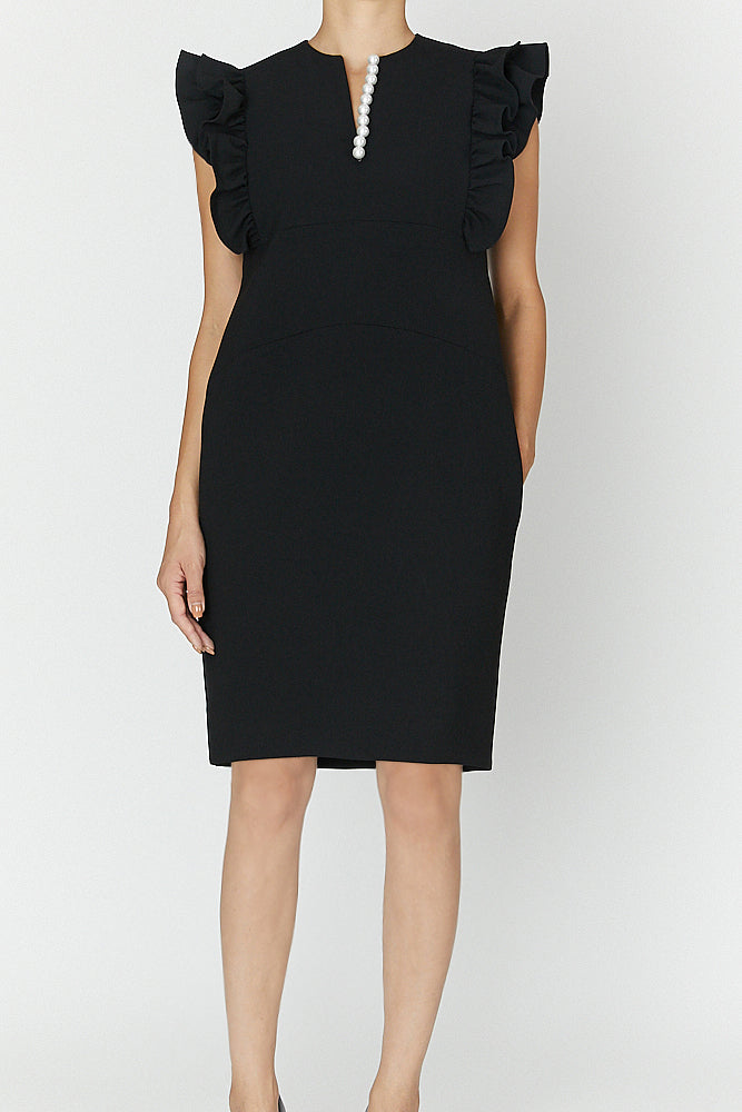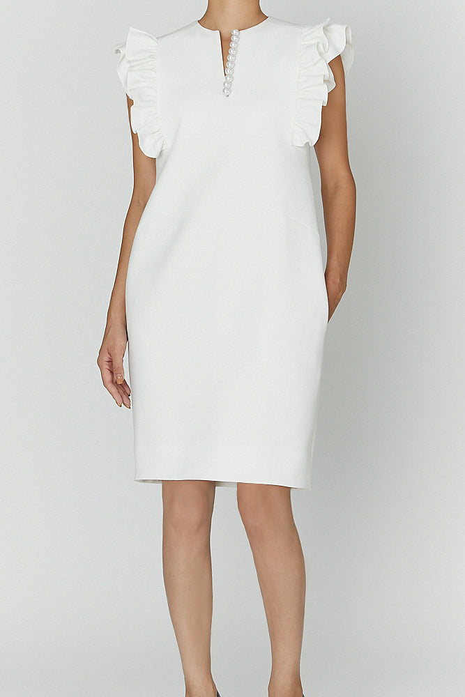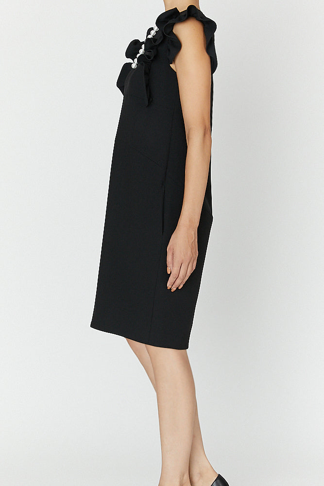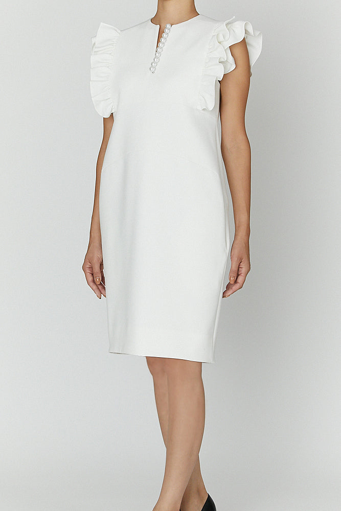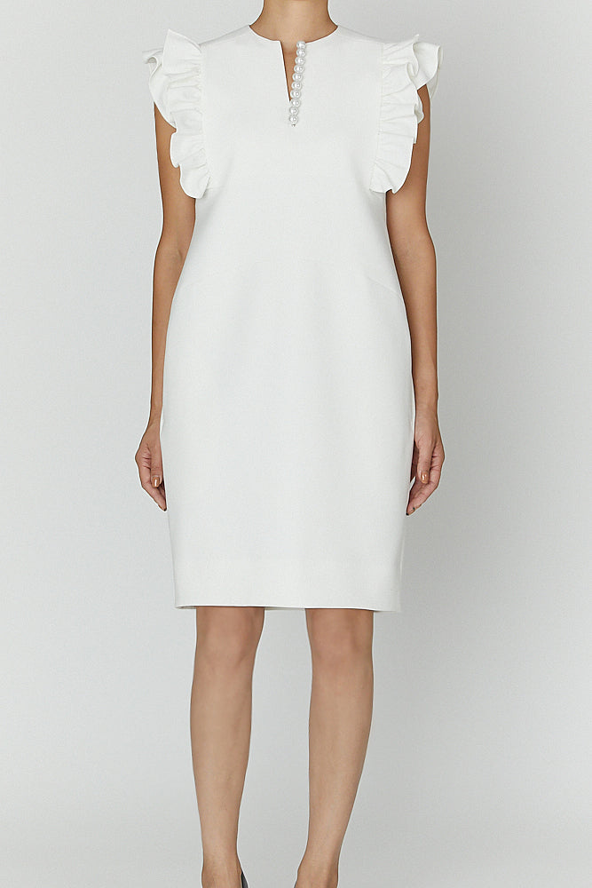 スリットネックを飾る大粒のパールとショルダーフリルが華やかで可愛らしいドレス。程よい厚みとマットな質感の生地で仕立てており、ハイウエストからヒップ付近に丸みを持たせ、裾に向かってやや細くしたメリハリのあるコクーンシルエットで、女性らしさを引き出した一着。