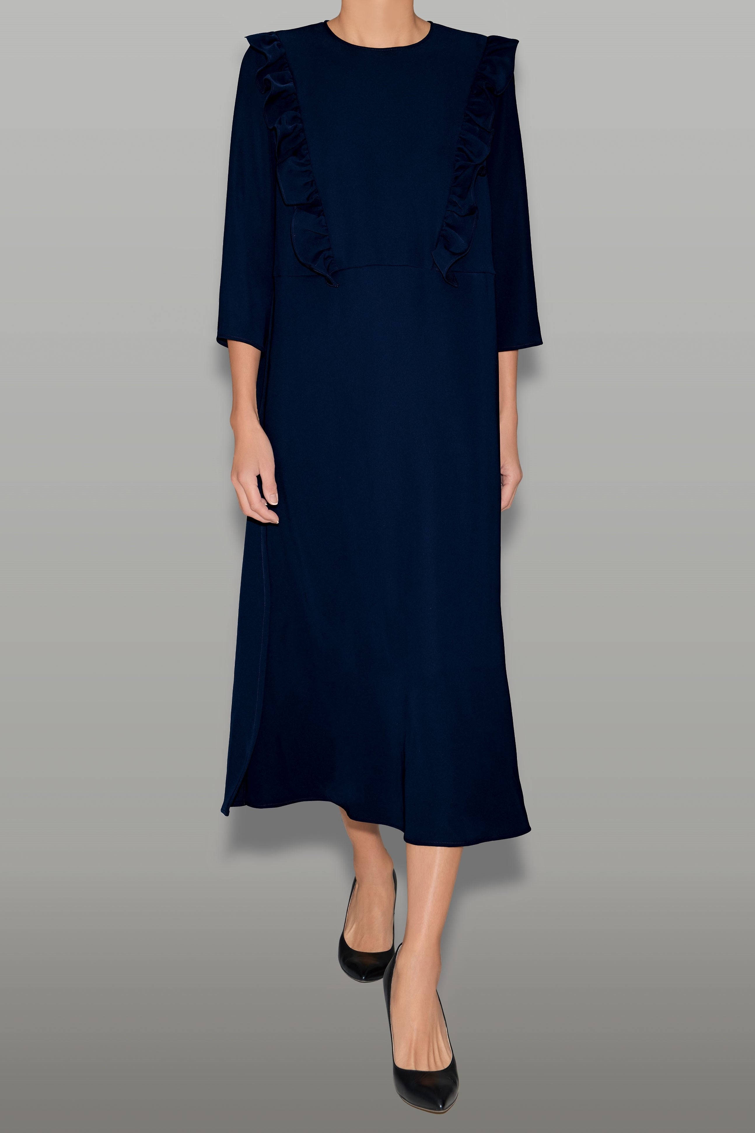 クラシカルな印象の中にフェミニンなディテールを取り入れたロングスリーブドレス。肩からウエストにかけて施された縦ラインのフリルが、自然な立体感と華やかさをプラス。やや広がりのあるAラインシルエットが体のラインを拾いすぎず、上品でリラクシーな着心地を実現。七分袖デザインでシーズンを問わず着用でき、フォーマルにもデイリーにも活躍する一着。