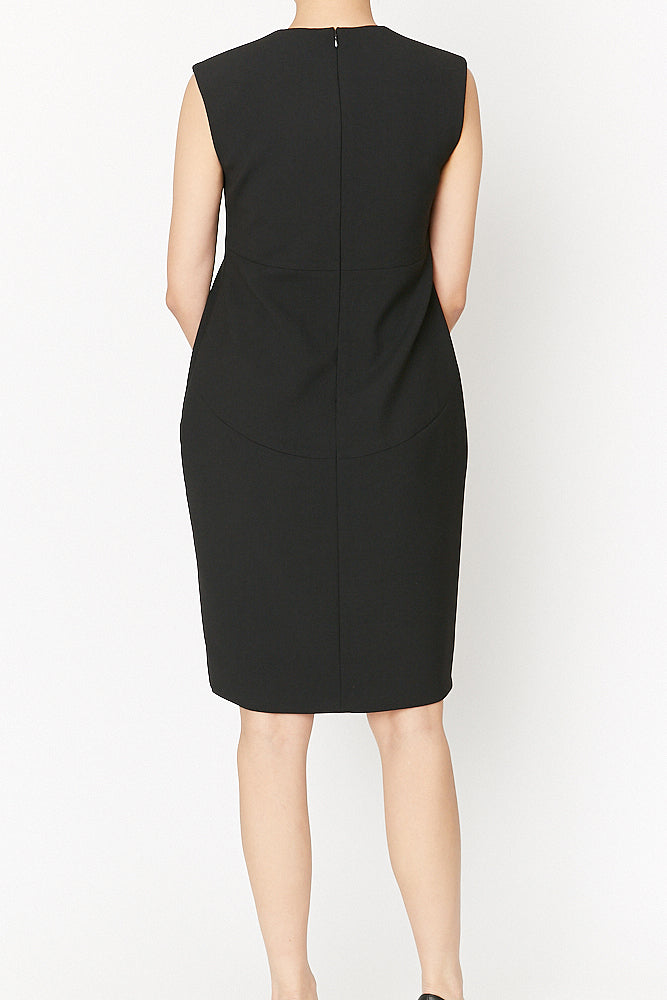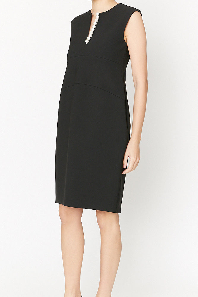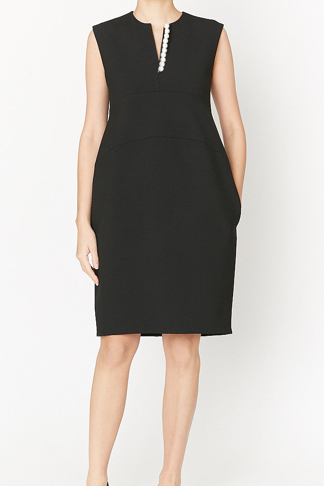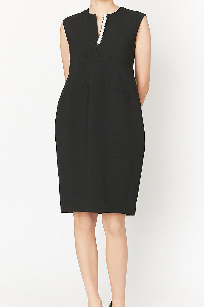 タイトなトップに女性らしい丸みのスカートラインが美しいメリハリスタイルを完成させるスリットラインドレス。スリットに沿ってパールをあしらい、上品な華やかさをプラスした一着。嬉しいポケット付き。